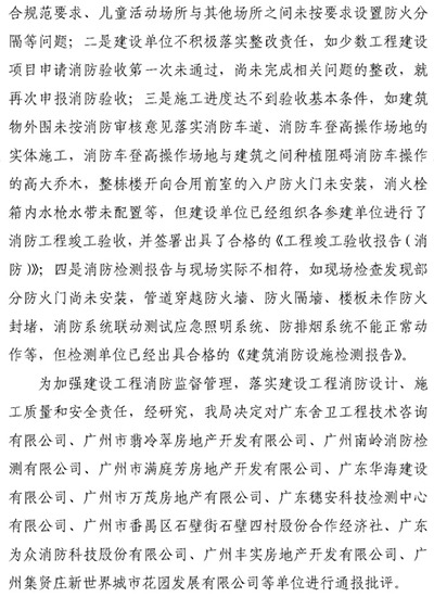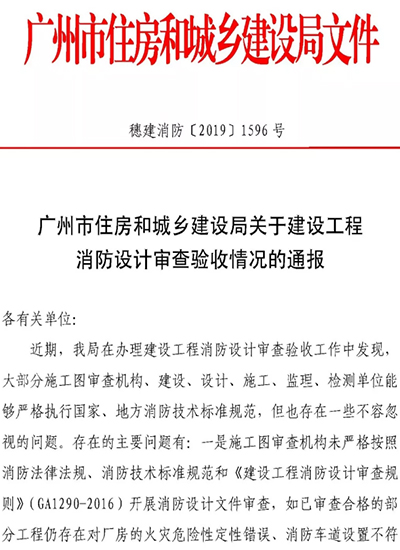 近期,廣州市住房和城鄉(xiāng)建設局在辦理建設工程消防設計審查驗收工作中發(fā)現(xiàn),大部分施工圖審查機構、建設、設計、施工、監(jiān)理、檢測單位能夠嚴格執(zhí)行國家、地方消防技術標準規(guī)范,但也存在一些不容忽視的問題。存在的主要問題有: - 一是施工圖審查機構未嚴格按照消防法律法規(guī)、消防技術標準規(guī)范和《建設工程消防設計審查規(guī)則》(GA1290-2016)開展消防設計文件審查,如已審查合格的部分工程仍存在對廠房的火災危險性定性錯誤、消防車道設置不符合規(guī)范要求、兒童活動場所與其他場所之間未按要求設置防火分隔等問題。