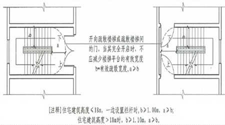 3、開向疏散樓梯或疏散樓梯間的門,當其完全開啟時,不應減少樓梯平臺的有效寬度。(6.4.11
