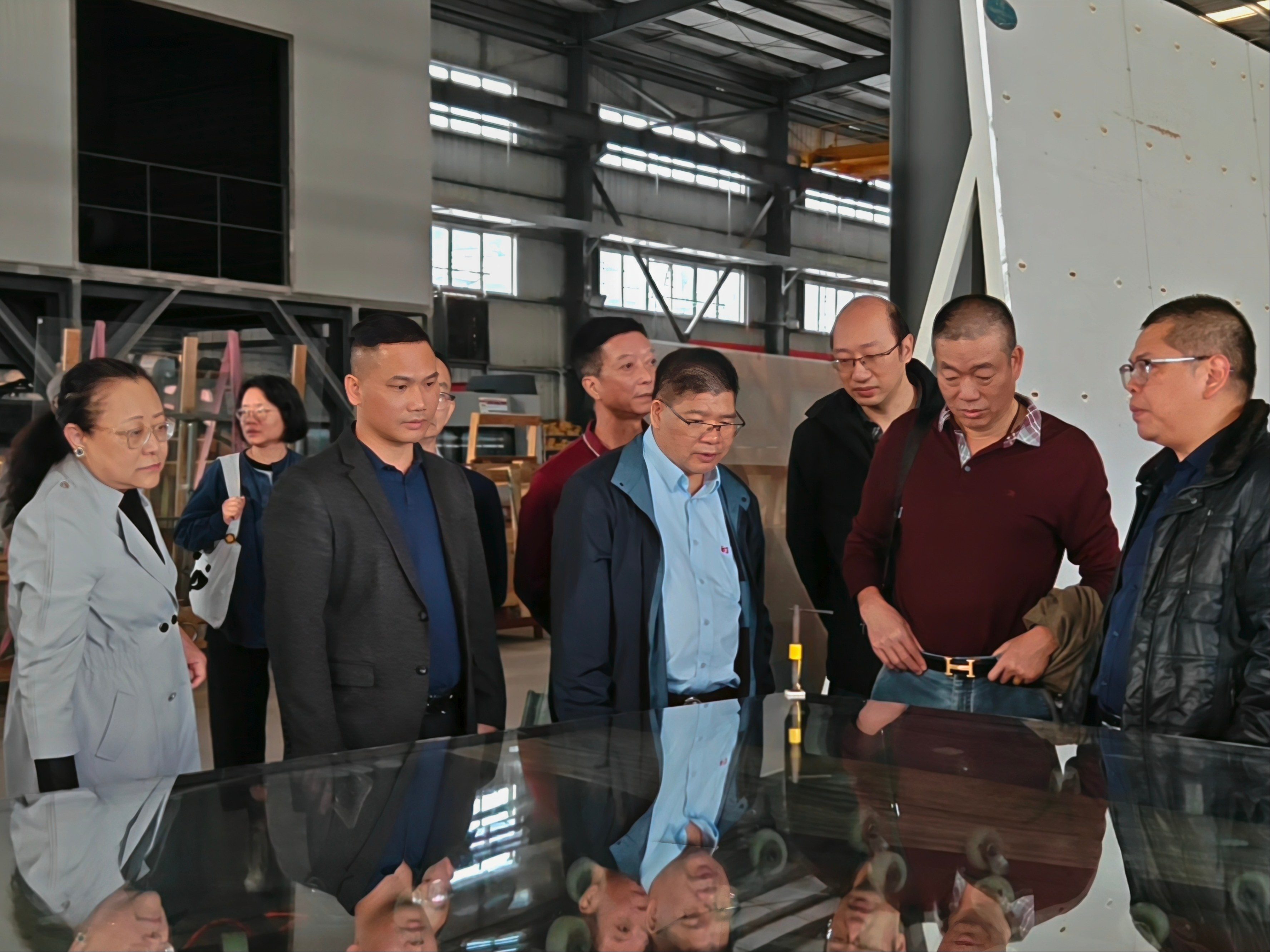 在董事長與業(yè)務經理的引導下,考察團移步至公司自動化生產車間。業(yè)務經理向代表們系統(tǒng)講解了防火玻璃從原片到成品的完整工藝流程,介紹了智能化生產設備在提升產品精度與穩(wěn)定性方面的作用。