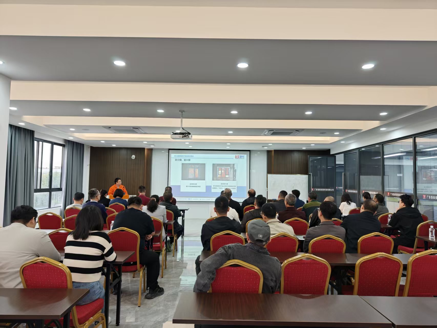 考察團前往恒保研發(fā)實驗樓觀看隔熱型防火玻璃與非隔熱型防火玻璃的對比實驗,通過直觀對比和專業(yè)講解,對不同類型的防火玻璃有了全方位認知。
